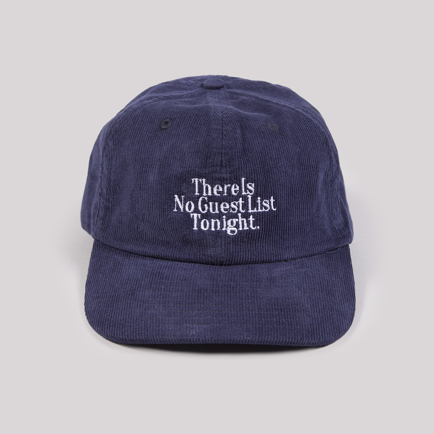 There Is No Guest List Tonight embroidered Black 6 panel cap. 100% cotton, adjustable fastener with metal clasp.
